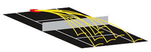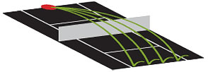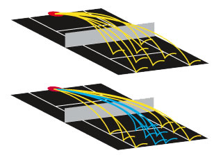 Si bien las máquinas con oscilación pueden lanzar pelotas de lado a lado de la cancha, la gran mayoría no puede variar la profundidad del disparo –por ejemplo si tu máquina está configurada para lanzar a la línea de fondo, entonces ella disparará las pelotas lado a lado pero siempre a la altura de la línea de fondo-. Las actuales máquinas en sus modelos más sofisticados sí son capaces de lanzar tanto pelotas cortas como tiros profundos. Por ejemplo, esta es una característica que poseen las máquinas Tennis Tutor en su modelo “Player”. En los siguientes diagramas se muestran las diferencias entre los patrones de oscilación de las diferentes máquinas lanza pelotas.