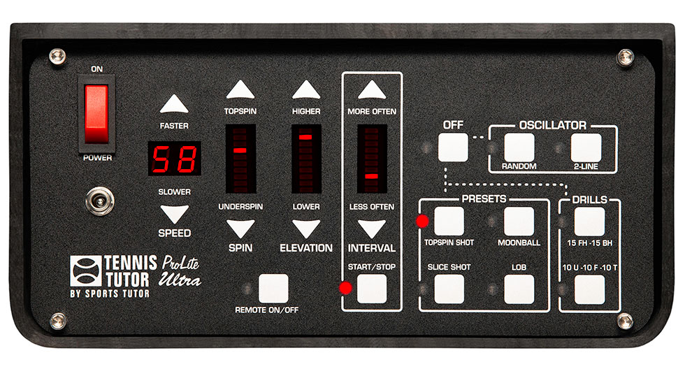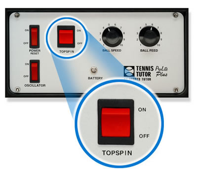 La Prolite Plus logra que respondas pelotas con topspin, con el simple pulsar de un botón. Solamente coloca el botón de Topspin en "ON" y la máquina automáticamente le añadirá un efecto liftado "topspin" intermedio a todos los lanzamientos. El nivel de efecto es un promedio del utilizado por jugadores intermedios - avanzados.